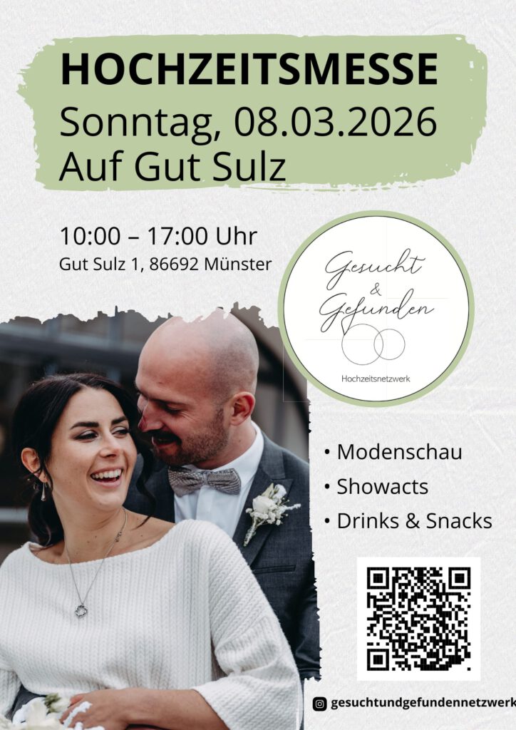 Wir laden euch herzlich ein zur Hochzeitsmesse des @gesuchtgefundennetzwerk auf Gut Sulz in 86692 Münster am Sonntag, 08.03.2026.